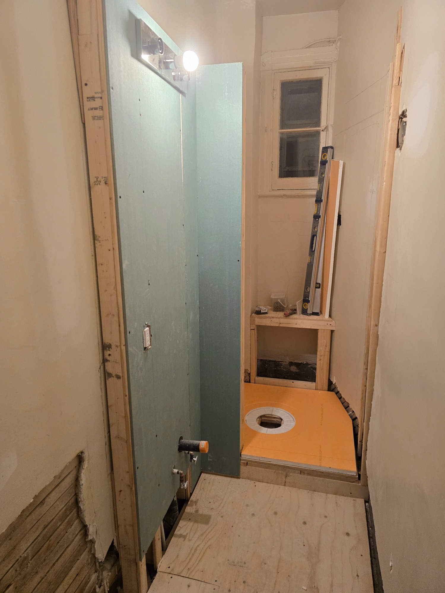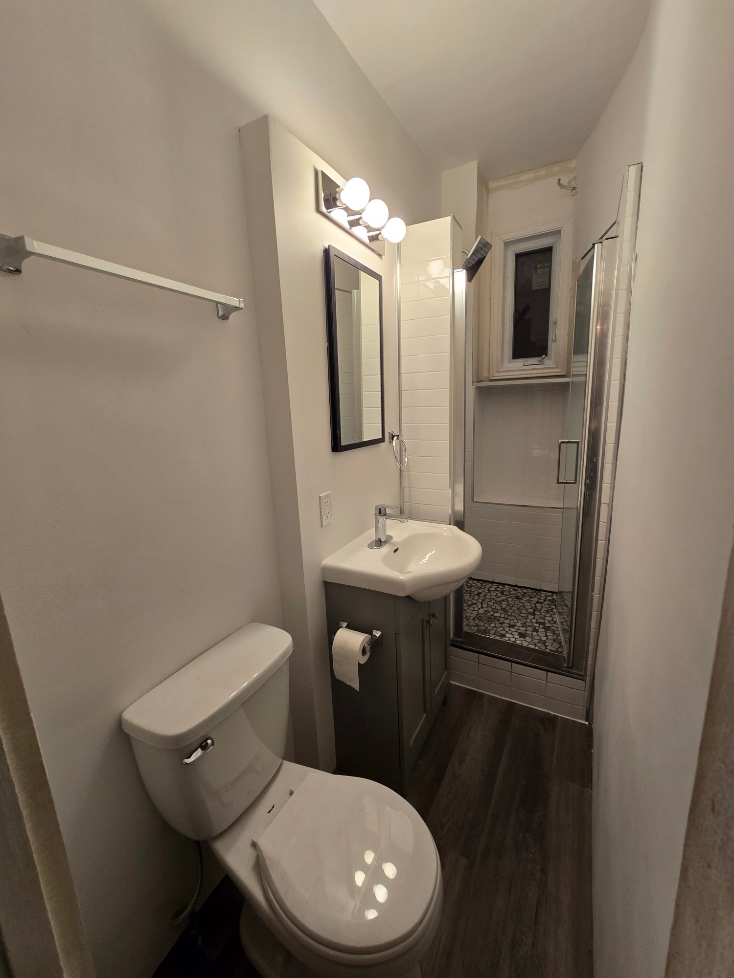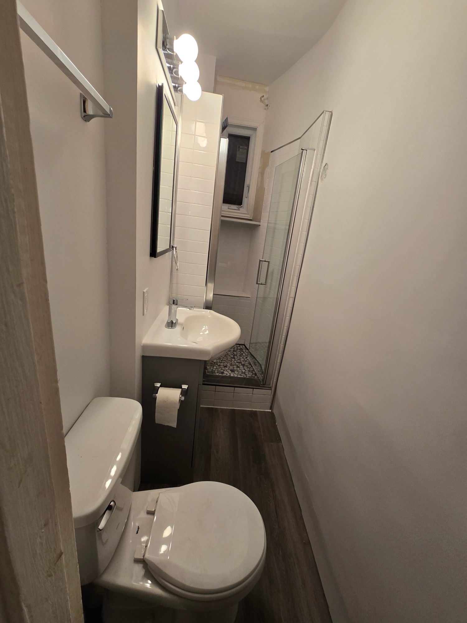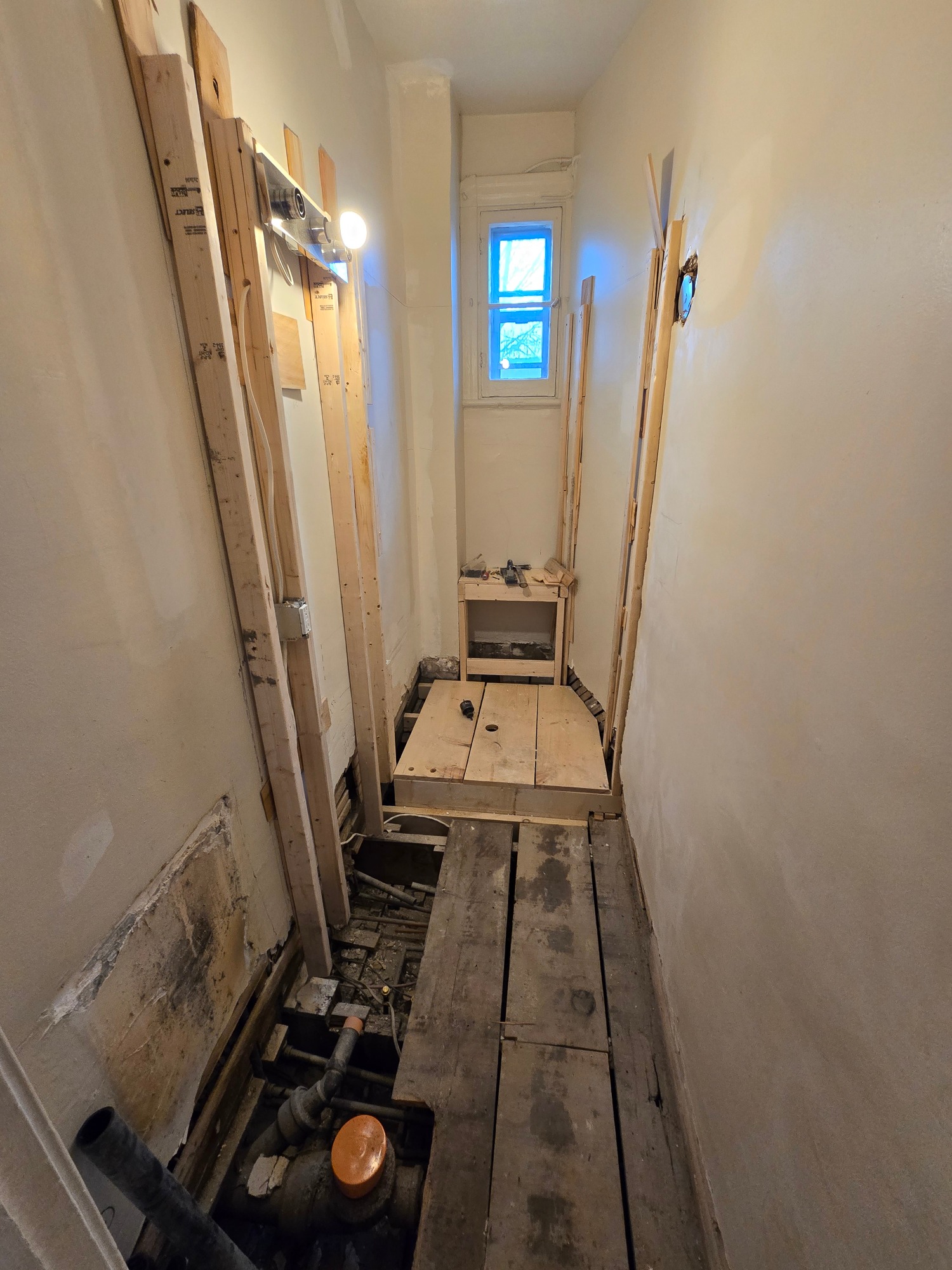 From this 3 x 10 foot space, where just a bathtub and toilet resided, we created this cozy bathroom with custom shower enclosure complet with sink, storage and everything one expects in a bathroom... but the tub had to be sacrificed!